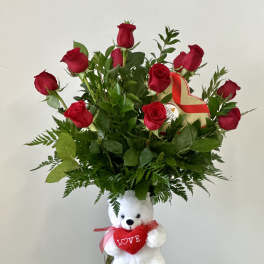 Sold OutPrice: $125.00Dozen Red Roses Vase with plush bear and chocolate box.
